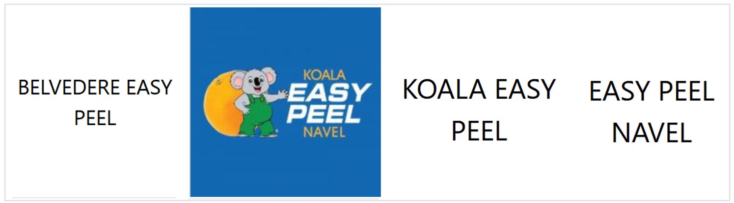 . . . Re1: citations from Belvedere Fruits Growers companywebsite: . “…Koala Orange Pty Ltd [aka Koala Easy Peel Navel Orange] are 100% Australia owned, and operated by Belvedere Fruit Growers… …The name itself “Belvedere” is a translation fromthe Italian language of meaning “Beautiful to See”…” . Re2: brands of Koala Orange Pty Ltd found in databases of registered trademarks: .  .