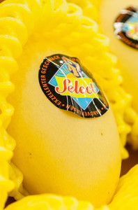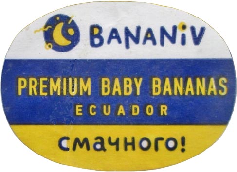 Re: inscription “СМАЧНОГО!” printed in Ukrainian Cyrillic on the sticker means "bon appetit" and probably appeared on fruits labels because produce was supplied specially for Ukrainian retailers. .