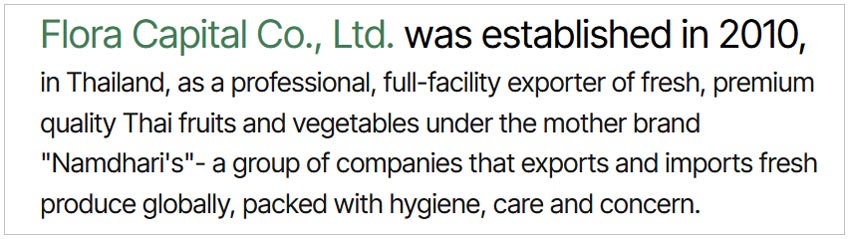 . . . Re: citation & screenshot from website of the company: . “…Namdhari Thai Fresh, is a brand of Flora Capital Co., Ltd., pioneering fresh produce exports from Thailand since 2010…” .