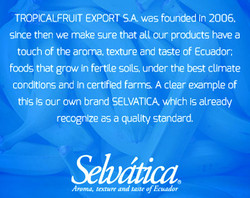 Tropical Fruit Export S.A. Location: Km 7.7 Vía al Puente Alterno Norte, Yaguachi, Ecuador Web: [https://www.tropicalfruitexport.com/] Brands: Bananas Organic; Selvática Carbon Footprint; Selvática Happy Holidays Carbon Footprint;