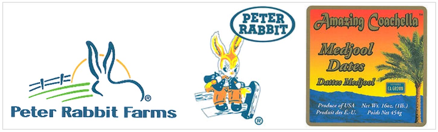 Peter Rabbit Farms Location: 85810 Peter Rabbit Ln, Coachella, California (CA) 92236, USA Web: [https://www.peterrabbitfarms.com/] Brands: Peter Rabbit Farms (logo); Peter Rabbit (b/l); Rio Red (logo); Amazing Coachella (b/l);