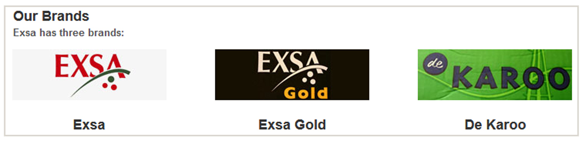 Exsa (Pty) Ltd Location: 100 Cecilia street, Cecilia Square, Paarl, Western Cape, 7600, South Africa Brands: EXSA (logo); EXSA Gold (n/c); De Karoo (n/c);