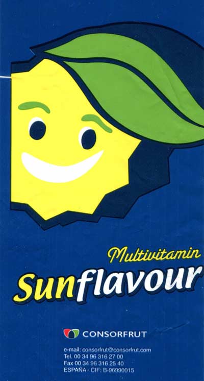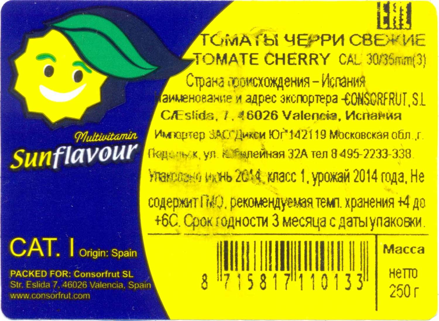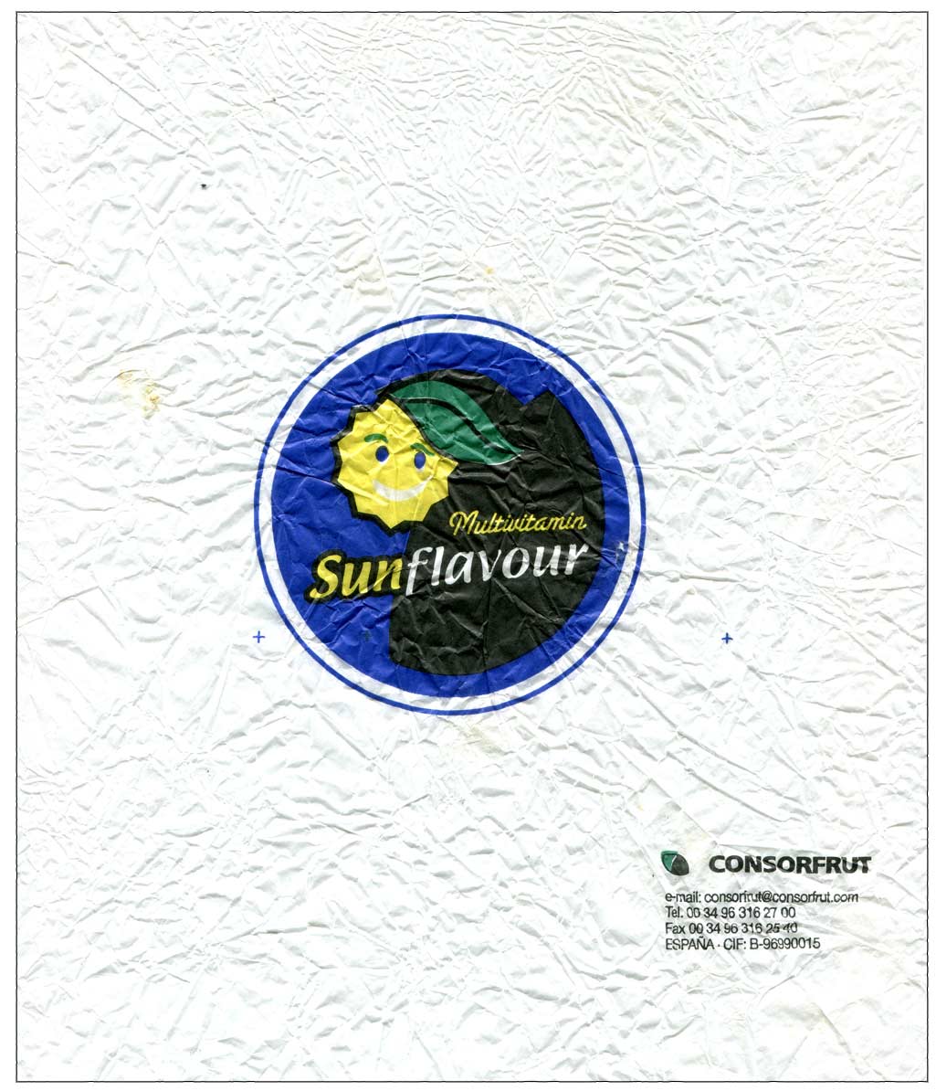 Слева направо этикетки испанской фирмы Consofrut: обыкновенная наклейка на цитрус, наклейка с коробочной тары из-под томатов-черри, далее 2 фрагмента бандерольных лент от сеточной упаковки с апельсинами и, наконец, обертка вощенной бумаги из ящика с мандаринами.